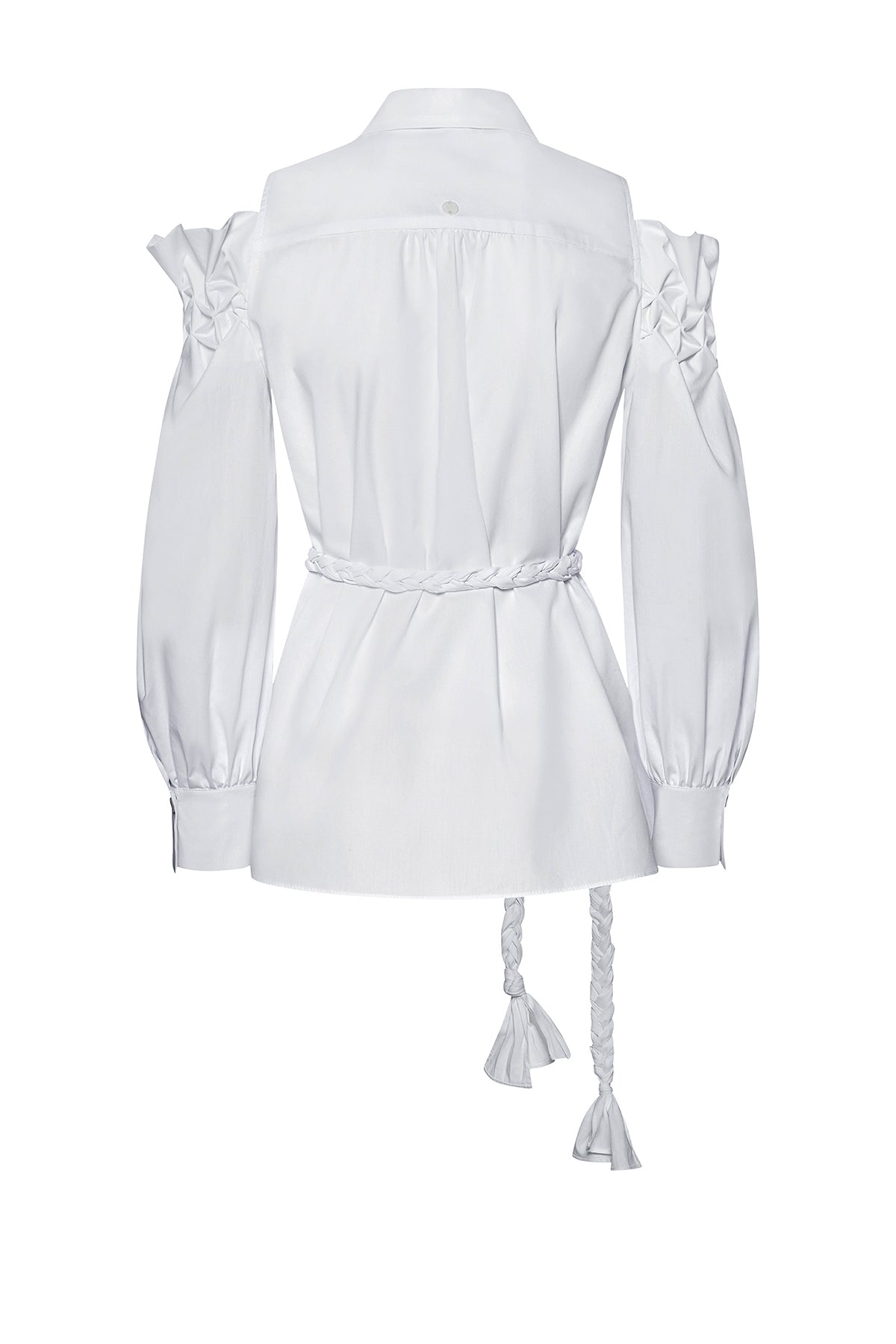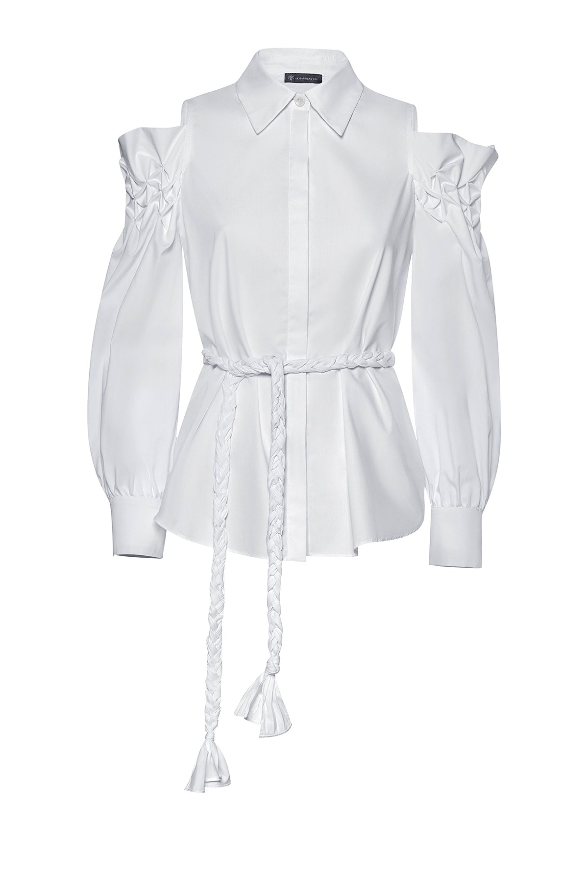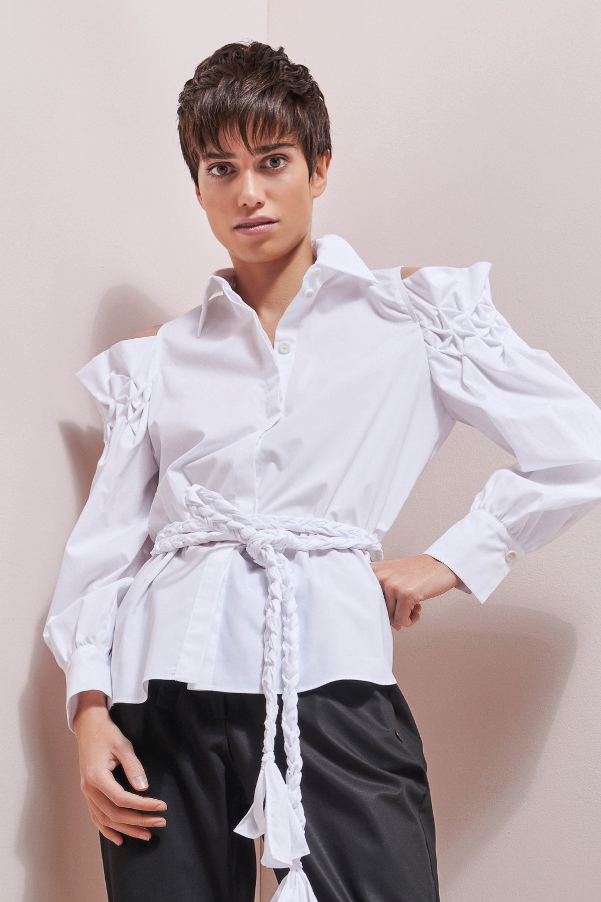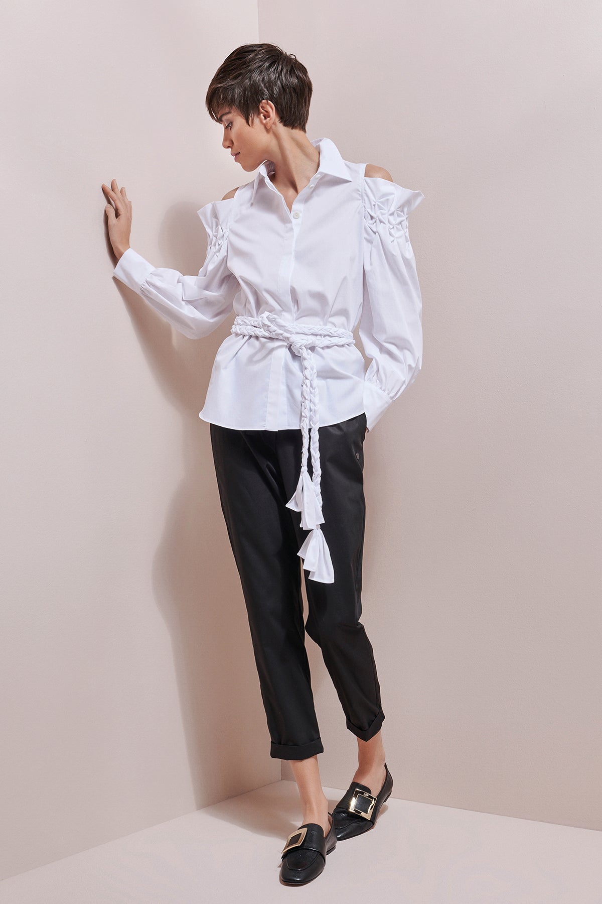 Sophia Moser, the founder of ARMARGENTUM, tries out each design on members of her team to see how flattering the cut looks on different body types. The straight fit of the Garance blouse can be tied with the matching belt to create a beautiful waist. The elaborate gathering at the shoulders gives the blouse a bold yet elegant detail. Tie your hair into a high ponytail or a wispy bun to reveal the gathered shoulders.