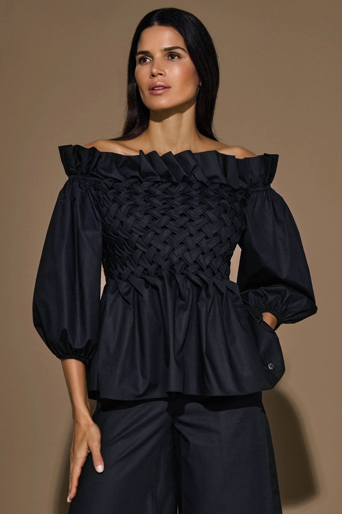 Off-the-shoulder tops like our JASMINE blouse with elegant balloon sleeves and a handmade smock in a braided look are the highlight piece for every season and the best sustainable alternative if you don't want to slip into a dress. So that you can wear this fabulous New Age classic in fall and winter too, we recommend thin turtlenecks or woolly blazer vests as cross-seasonal styling partners.