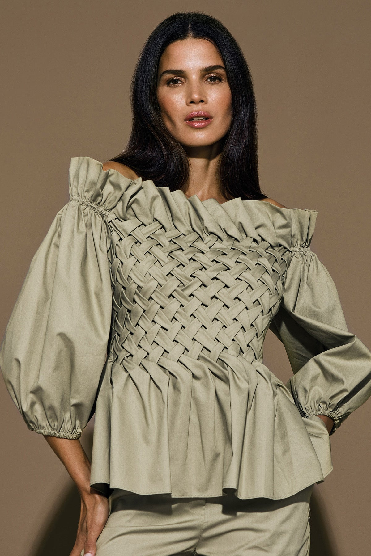 Off-the-shoulder tops like our JASMINE blouse with elegant balloon sleeves and a handmade smock in a braided look are the highlight piece for every season and the best sustainable alternative if you don't want to slip into a dress. So that you can wear this fabulous New Age classic in fall and winter too, we recommend thin turtlenecks or woolly blazer vests as cross-seasonal styling partners.