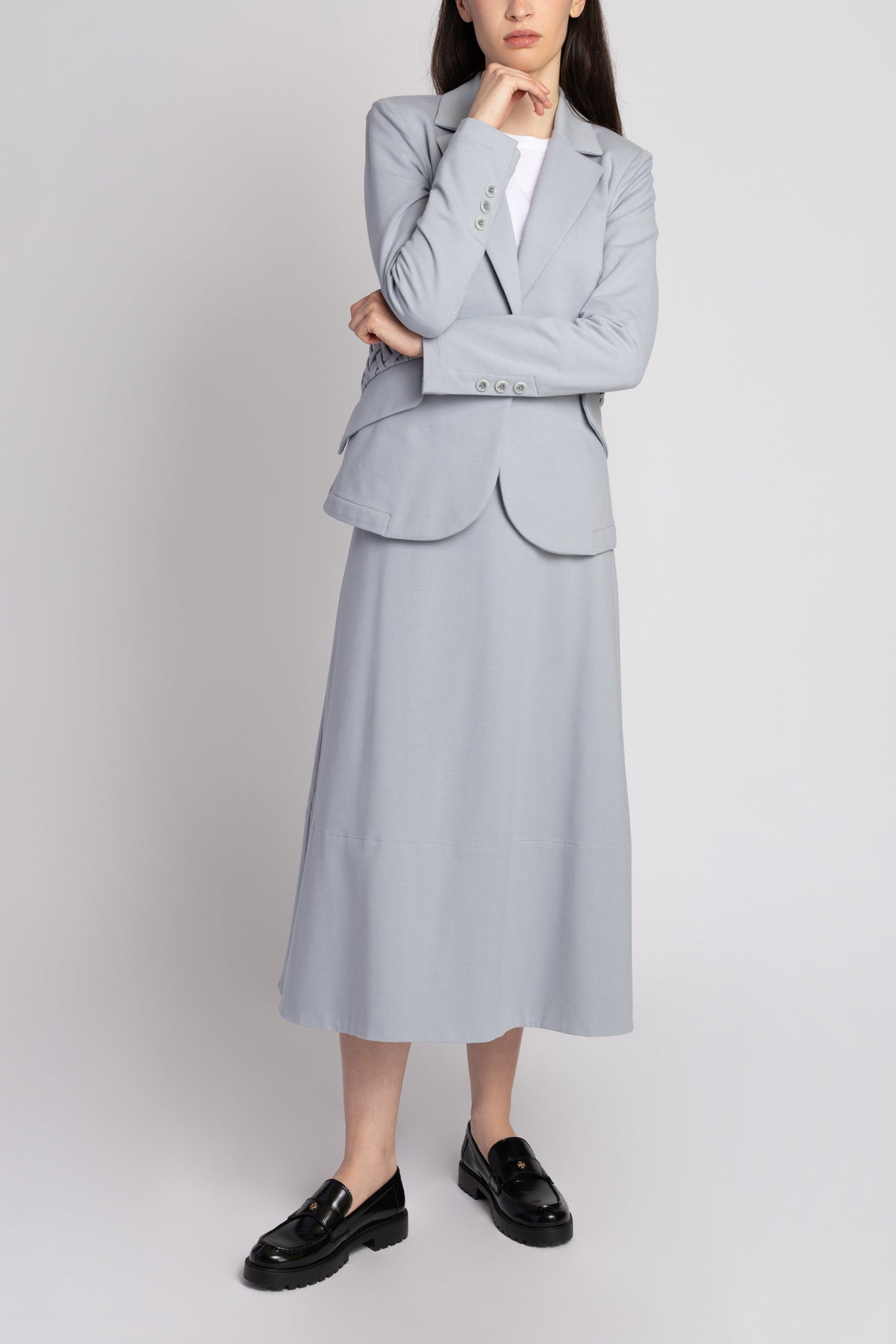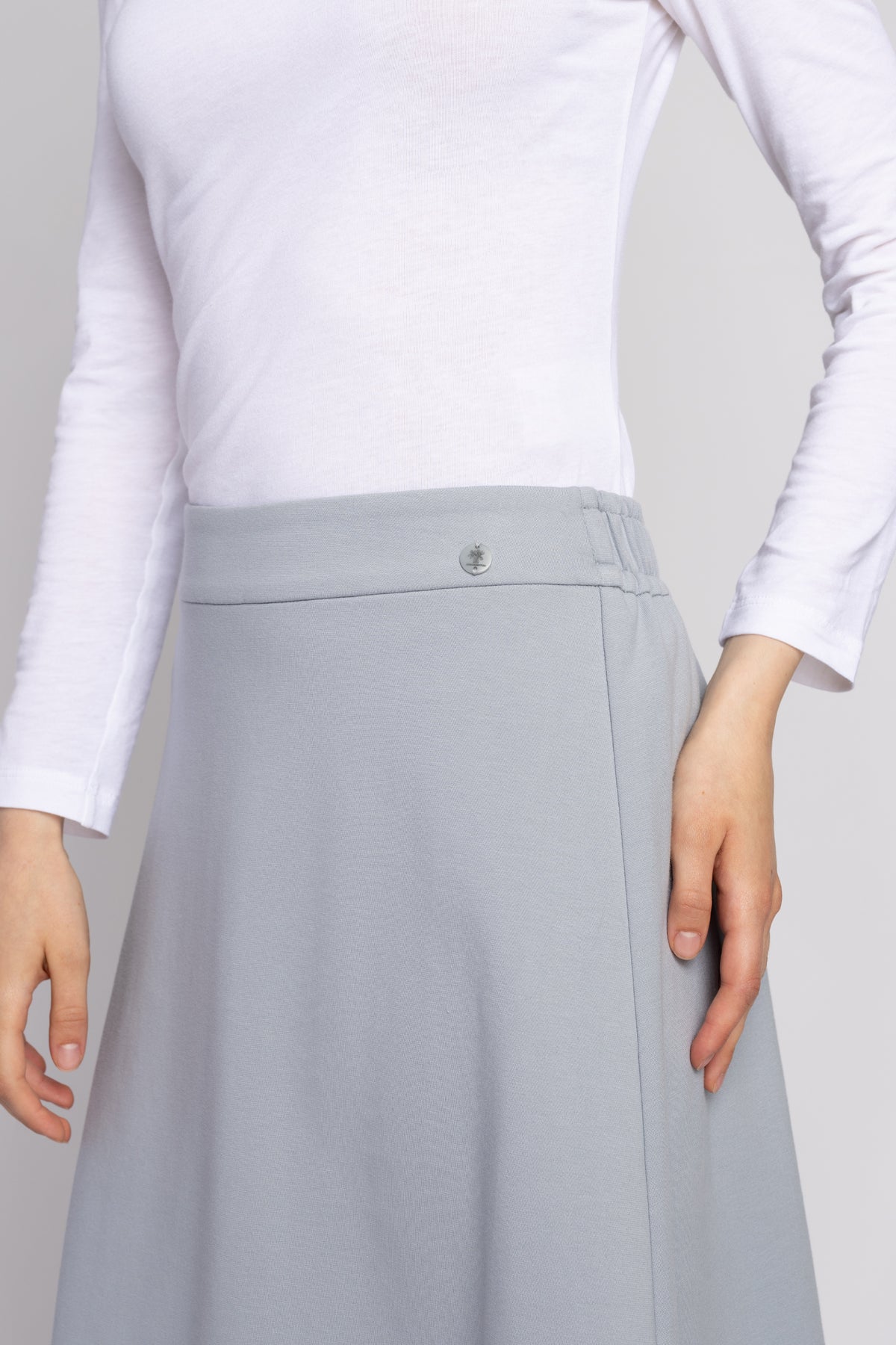 The MERIT lounge skirt combines the comfort of jogging bottoms with the elegance of a suit! Made from sustainable cotton jersey in black, navy and dove blue, it is the perfect companion for any occasion. Whether casual with a hoodie, cozy with a cashmere sweater, formal with a blazer or elegant with a MEDINA blouse - this skirt shows just how versatile eco-conscious luxury fashion can be!