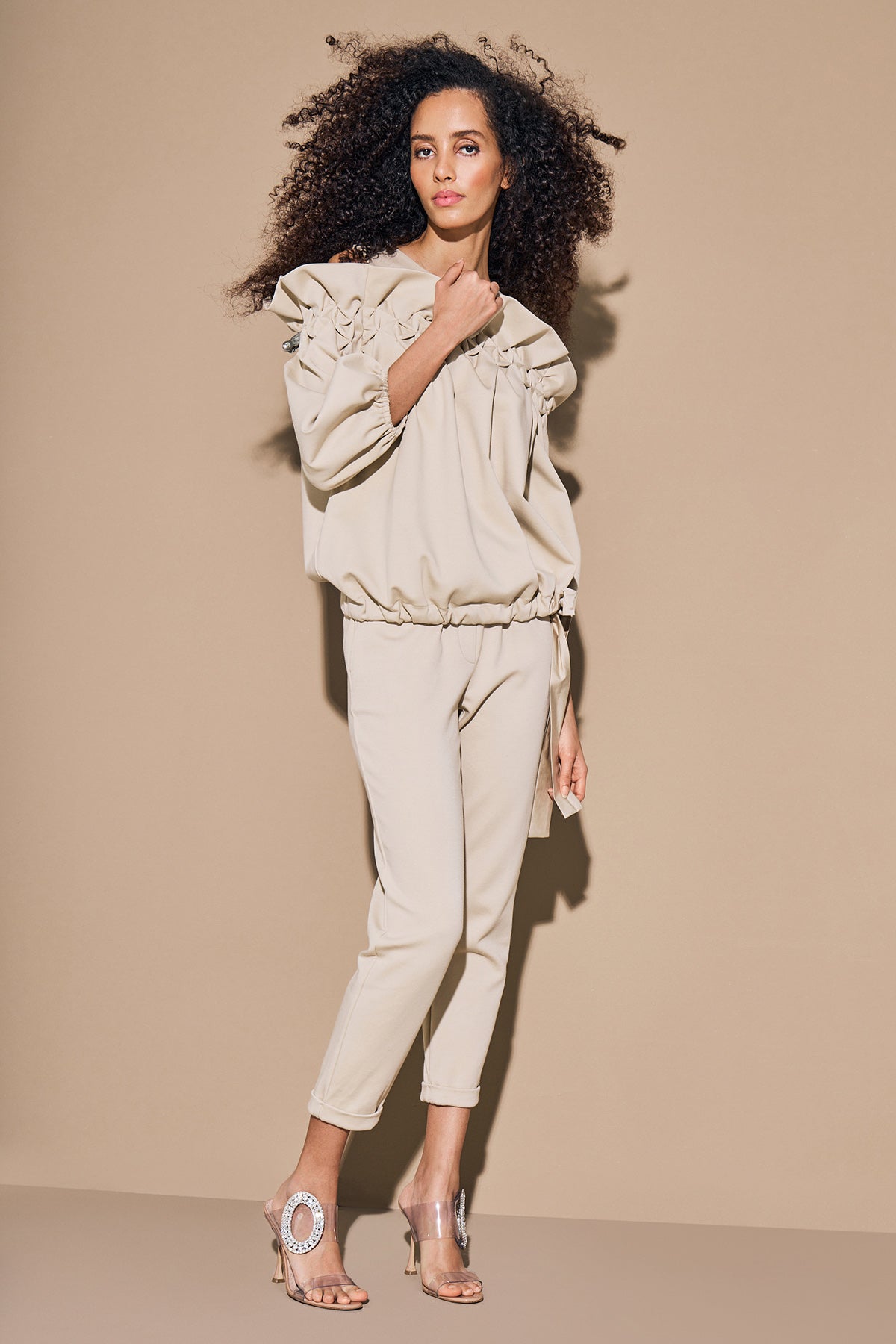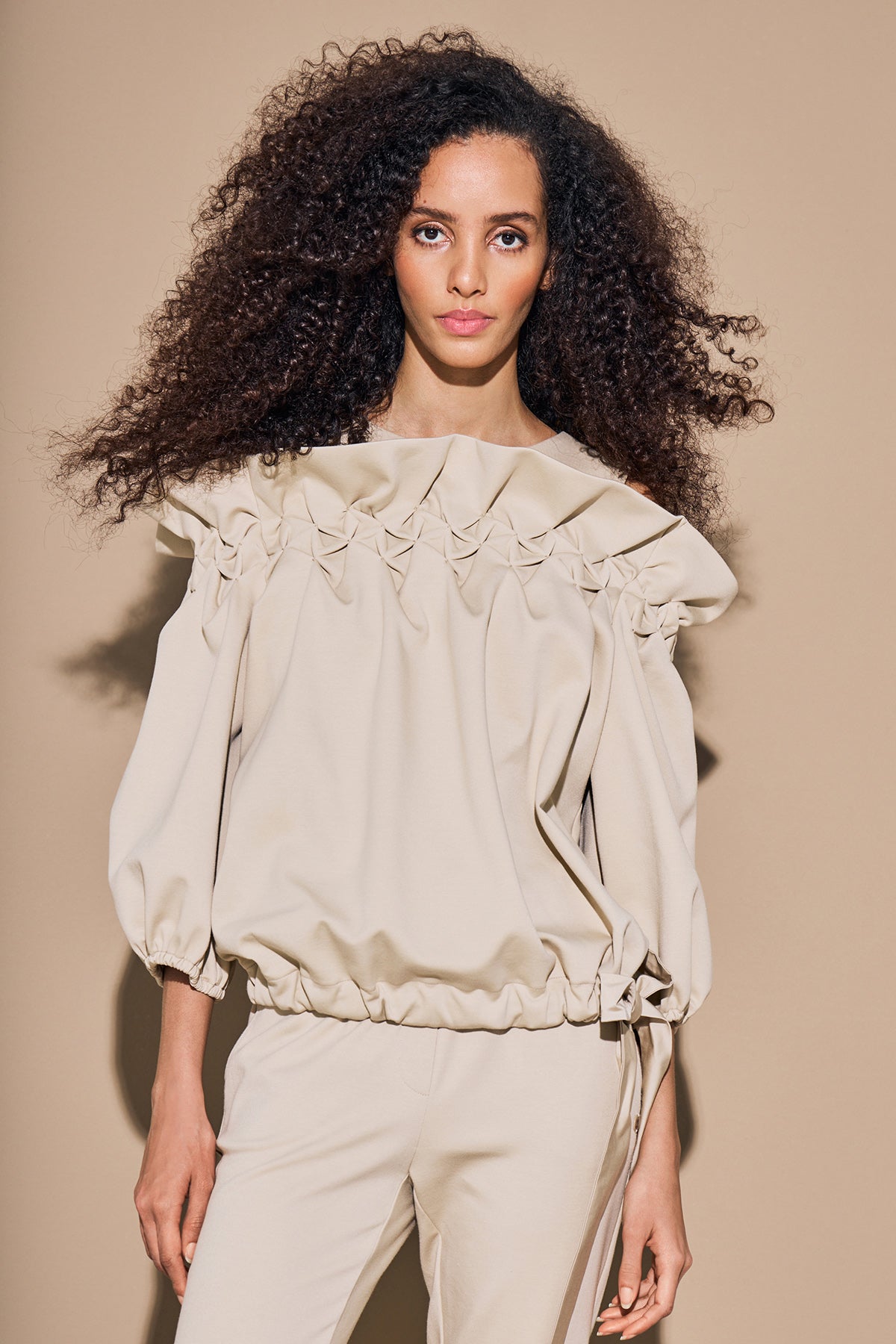 If you're looking for an ecofriendly top with the ultimate wow effect, then you've come to the right place - because in our JADE Lounge-Sweat top, an ultra-modern tank top neckline meets romantic balloon sleeves and a fascinating, hand-smocked carmen neckline. At the same time, you're free to define your own silhouette with the handy tunnel strap. Let it fall loosely over your hips in combination with our narrow FAMA lounge pants or wear it tied high in the waist with our wide JOYCE lounge pants. Whatever you choose, the luxurious cotton material and high-quality workmanship guarantee maximum comfort.