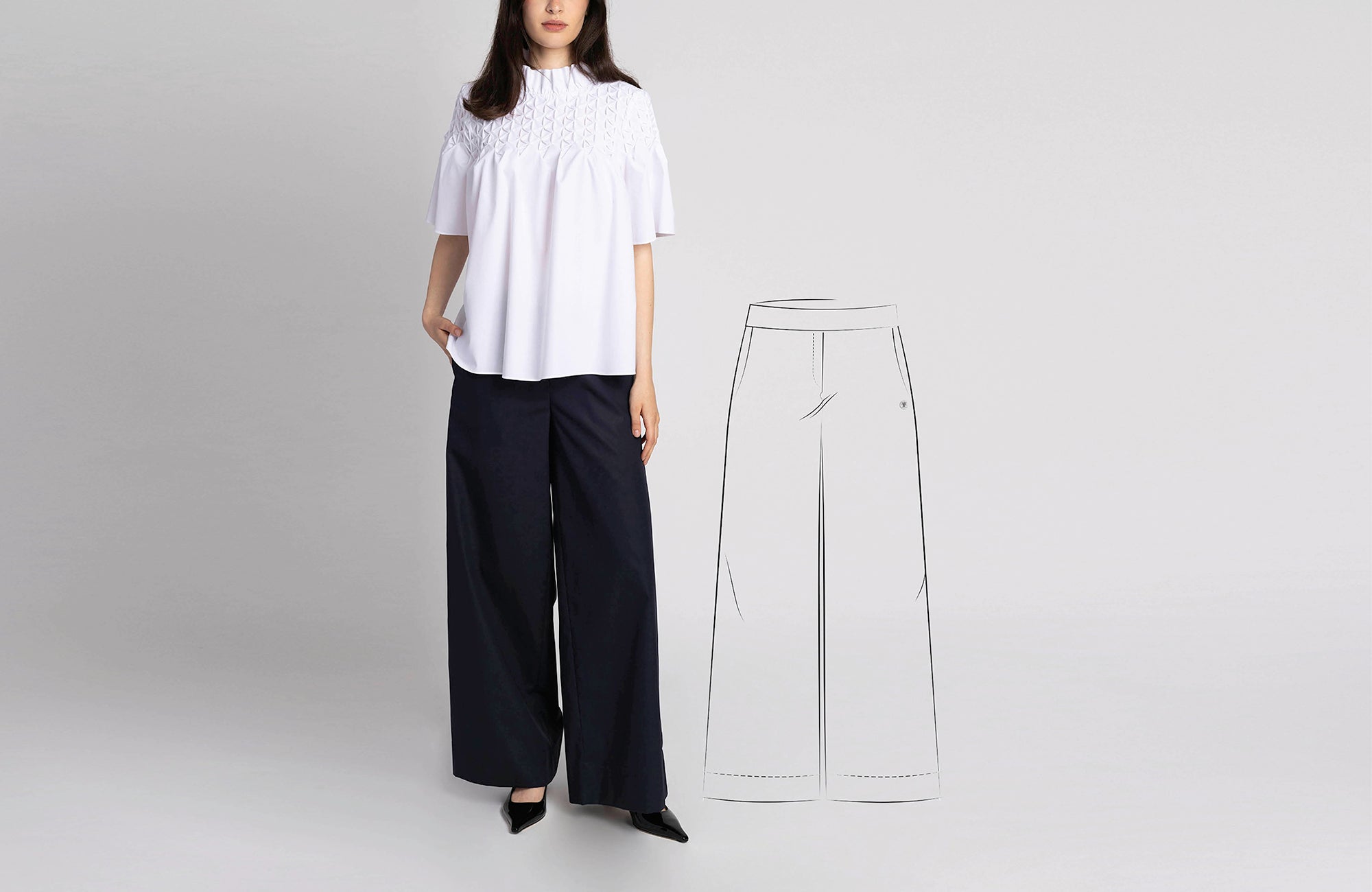 La coupe globalement large avec une jambe ample qui s'élargit encore en partie vers l'ourlet