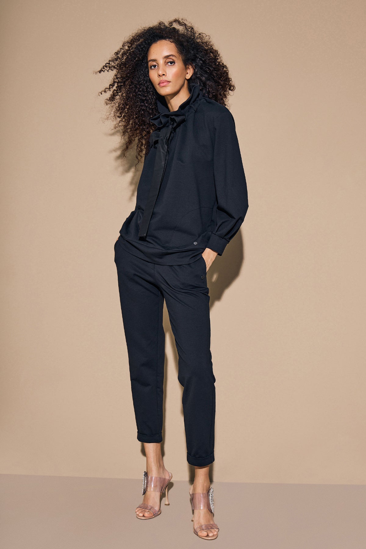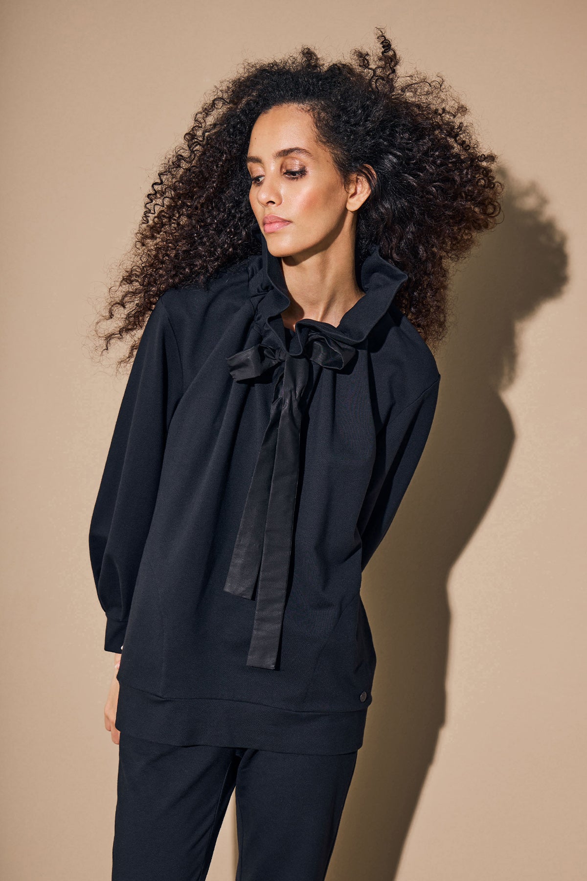Nous le promettons : Notre sweat-shirt de salon JOSELLE en coton de haute qualité est le haut de salon le plus polyvalent de la saison. Pourquoi ? Parce que l'élégante bande tunnel offre une infinité de possibilités de style : Nouez-le en une maille classique, laissez-le retomber de manière décontractée et tirez le pull sur une épaule avec audace ou attachez-le de manière décontractée en un nœud de cravate. Votre créativité n'a pas de limites.