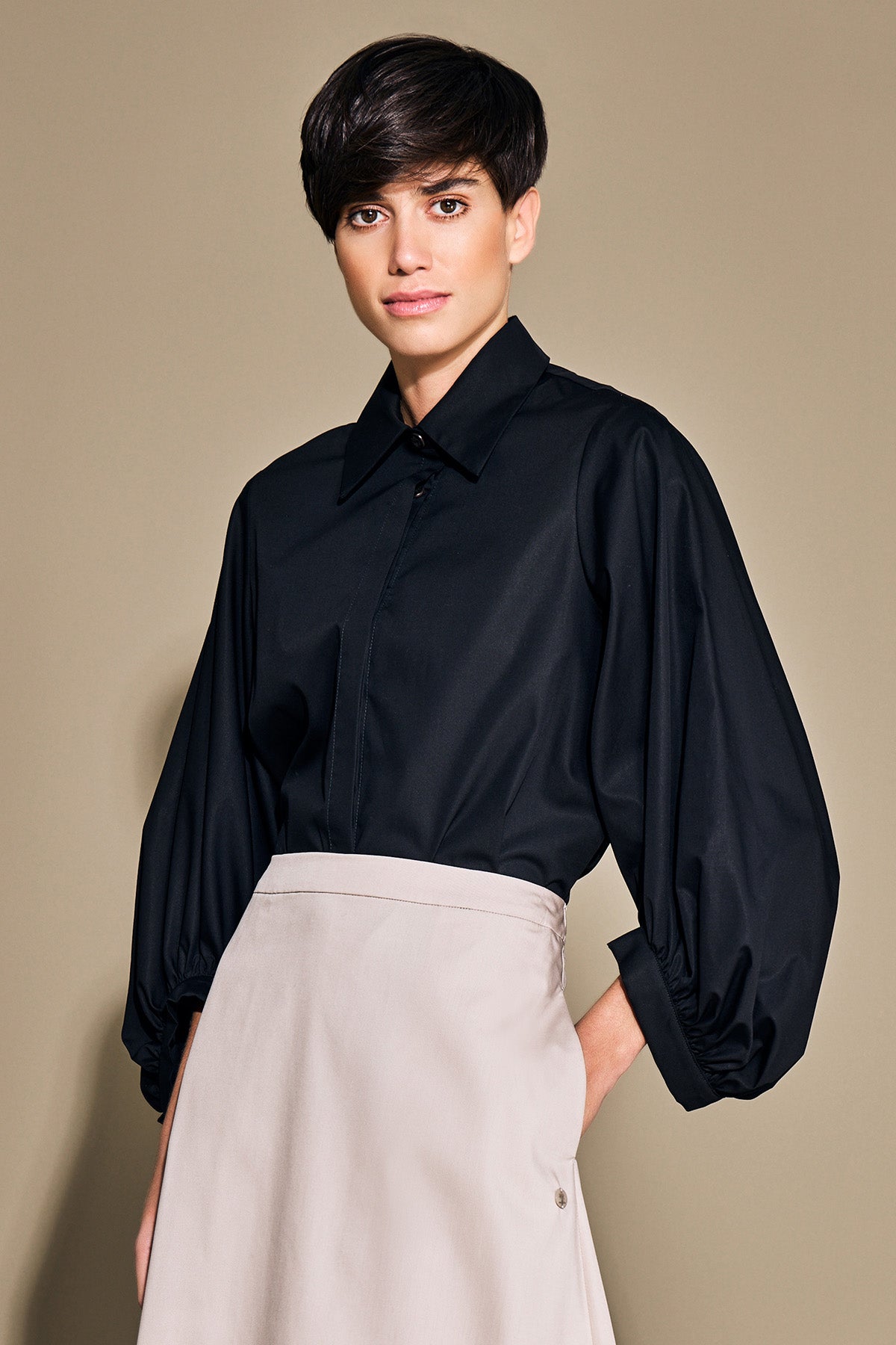 Cette blouse ultramoderne en notre fibre Miracle unique a des manches ballon de longueur 3/4 et une coupe droite. Elle se porte parfaitement avec un jean, une jupe midi ou un pantalon blanc.