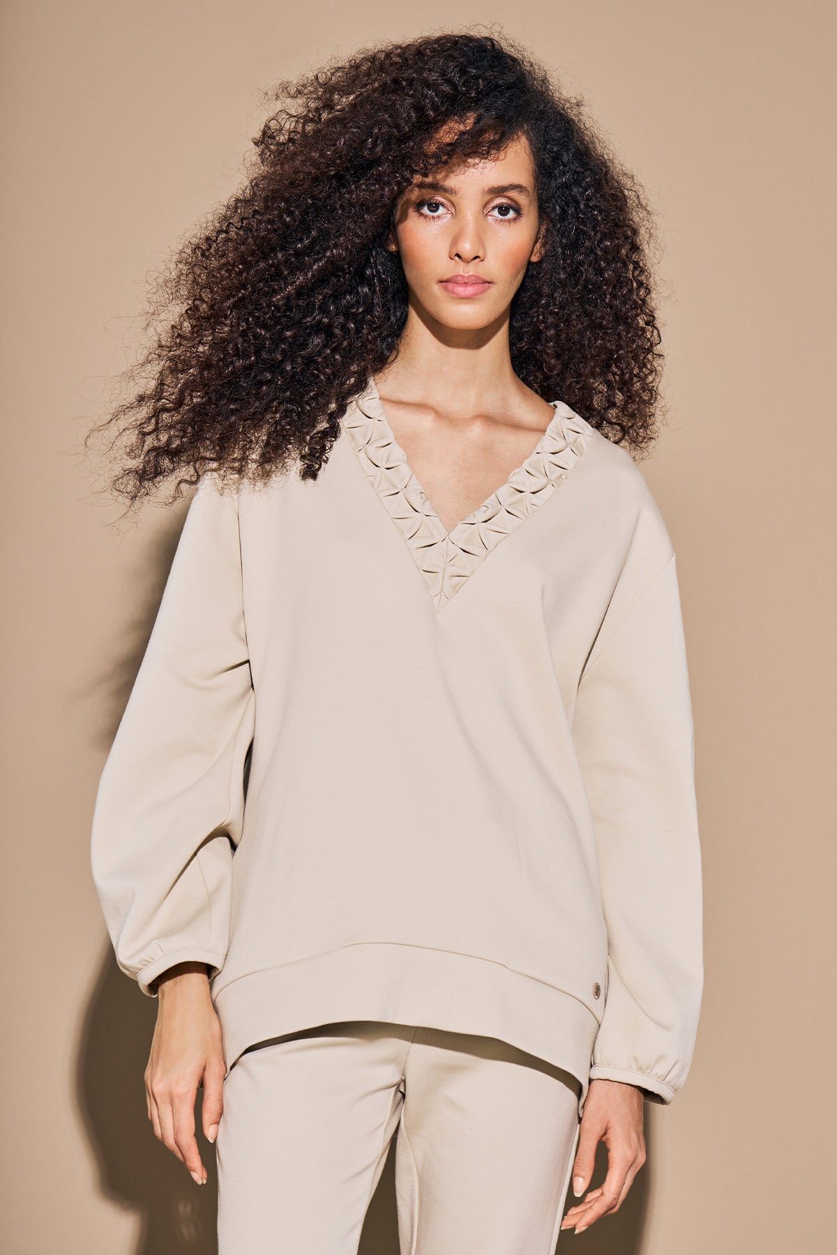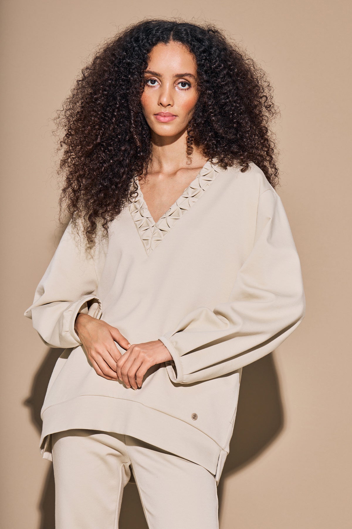 Il est à la fois douillet et super sexy : notre sweat JACY en jersey de coton luxueux avec une encolure en V très profonde, des épaules légèrement recouvertes et des poignets décontractés est LA pièce mode de la saison qui fonctionne du marathon Netfilx à la soirée des parents et au cocktail. Notre conseil : le décolleté smocké spectaculaire est le plus beau et le plus subtil sans superposition visible ou en combinaison avec plusieurs chaînes filigranes qui peuvent volontiers disparaître dans le décolleté.