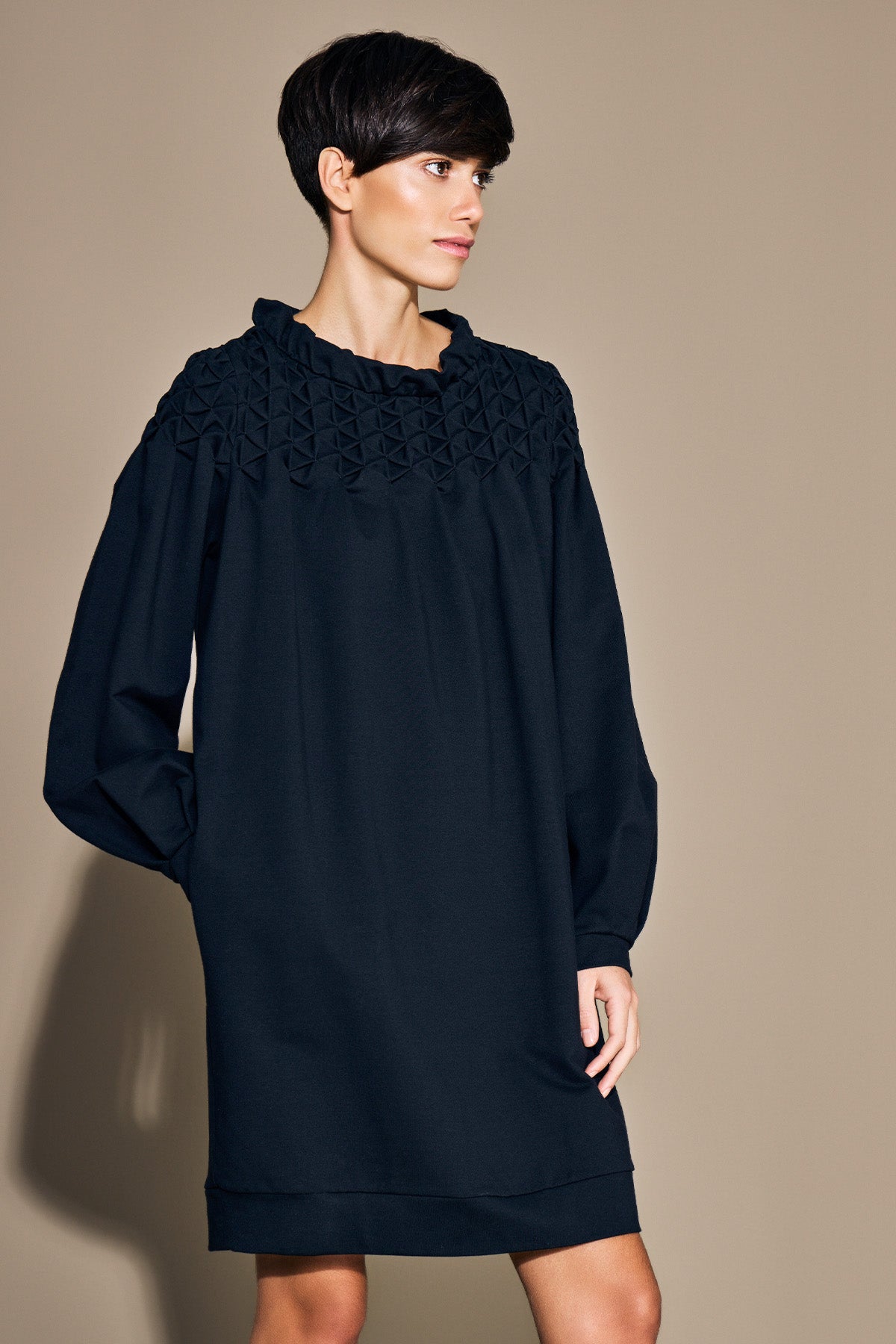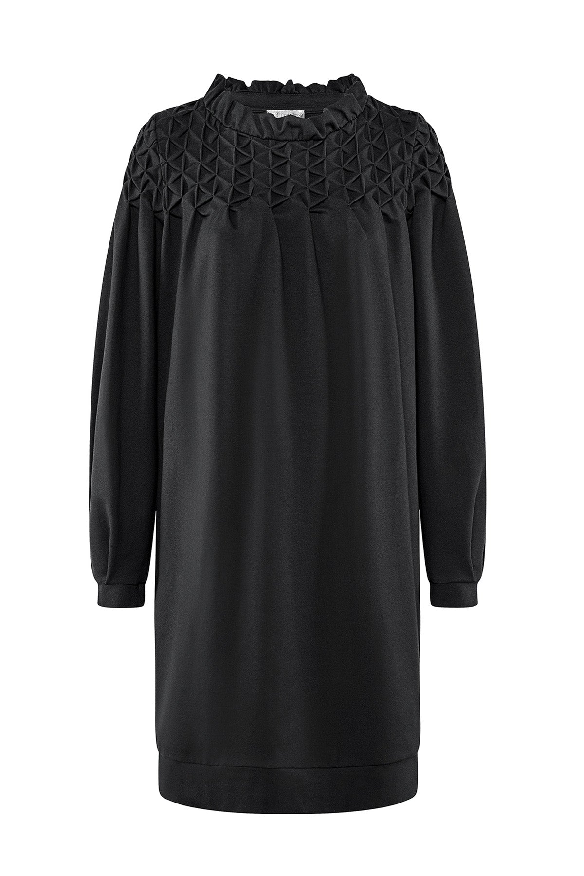 Féminine, stylée et tout simplement confortable : notre robe JOJO en noir élégant est la pièce lounge parfaite si vous avez envie d'une tenue de tous les jours avec un vrai facteur de détente. Le mélange intelligent de jersey de coton luxueux, de poches pratiques, de poignets sportifs et d'un design smocké excitant ne fonctionne pas seulement pour les soirées cinéma sur le canapé. Avec des pantoufles élégantes et des boucles d'oreilles glamour, vous vous invitez à un dîner, avec des overknees et un trench-coat, vous allez faire du shopping en ville, avec des sneakers et notre scrunch FLEUR, vous allez à un anniversaire d'enfant. Vous voyez, les possibilités de style sont presque illimitées.