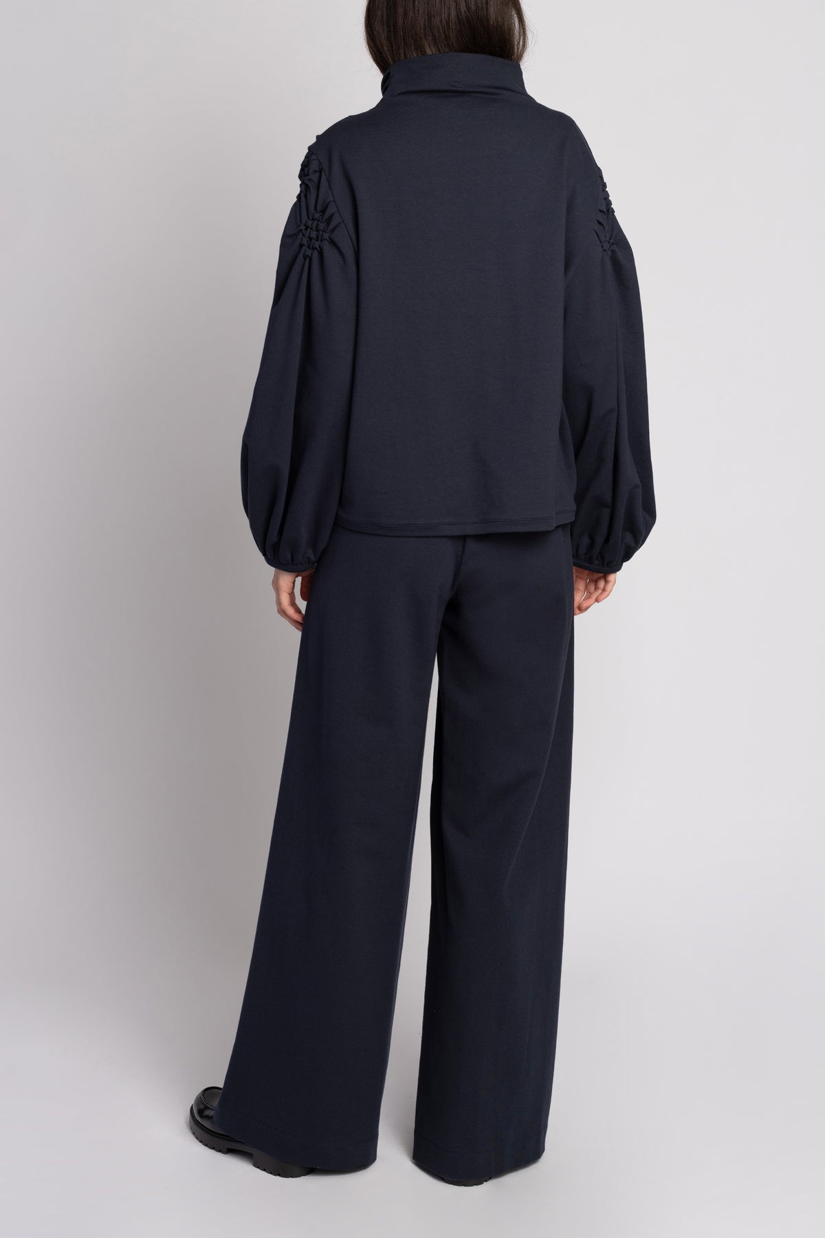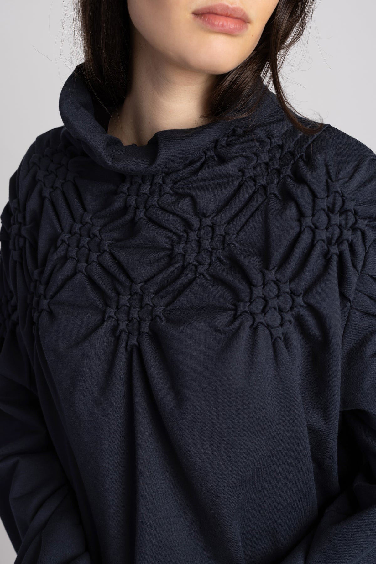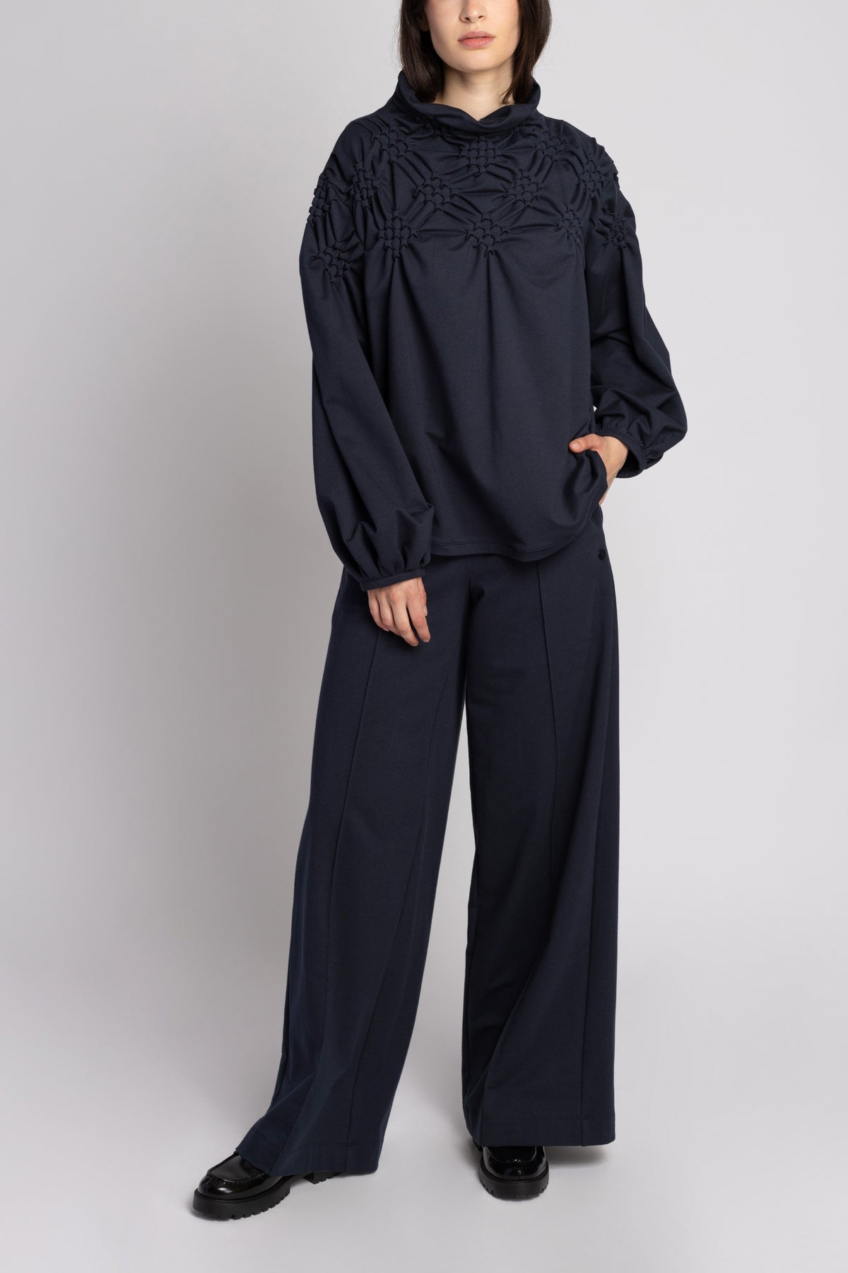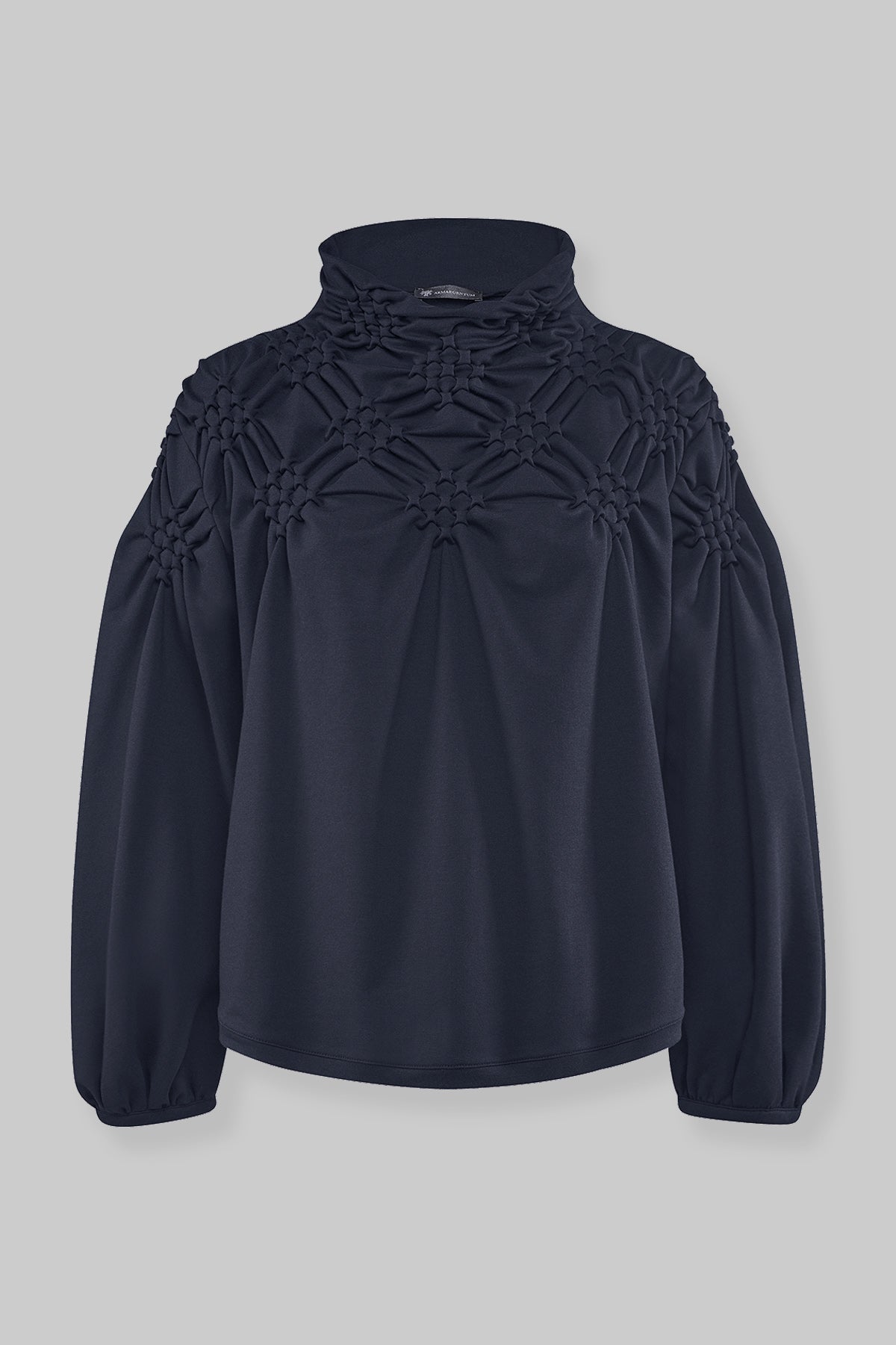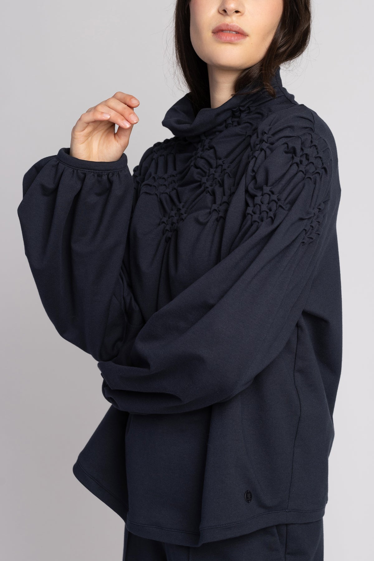 Modeliebhaberinnen verfolgen alle das gleiche Ziel: Sie wollen umwerfend aussehen und sich dabei wohl und ganz wie sie selbst fühlen. Mit unserem KAREN Lounge-Sweat wird dieser Modetraum Wirklichkeit, denn das nachhaltig gefertigte Oberteil verbindet den kuschelweichen Tragekomfort von hochqualitativem Baumwolljersey mit dem faszinierenden Look von handgearbeitetem Blumen-Smok. Der lässige Stehkragen und die überschnittenen Schultern sorgen in Kombination mit den edlen Ballonärmeln zudem für eine stilvolle Harmonie, die sich mühelos in jede Garderobe einfügt. Damit Sie zu jeder Zeit spektakulär entspannt aussehen und sich auch so fühlen können.